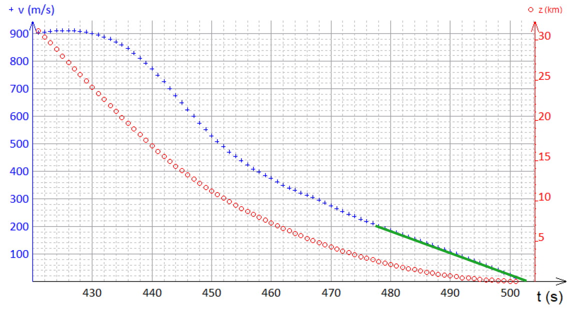 3. On voit qu’à partir de 470 secondes environ, $*v(t)*$ décroît linéairement. Donc sa dérivée (l’accélération) est constante. Pour trouver sa valeur, il faut calculer la pente de la droite tracée en vert sur la figure ci-dessous.
