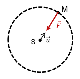 3.1. Expression du vecteur accélération dans le repère de Frenet : $µ \vec{a} = {\mathrm{d}v \over \mathrm{d}t }\vec{u}_t + \frac{v^2}R \vec{u}_n µ$ Ici, $*\vec{u_n}*$ = $*-\vec{u}*$ et $*R = d_{MS}*$. Donc, par identification des deux expressions de l’accélération, on en déduit que :