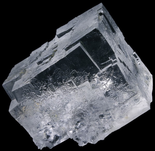 Cette structure microscopique est d’ailleurs responsable de la forme des cristaux à l’échelle macroscopique. Sur l’illustration ci-dessous, regardez les angles formés par les différentes faces du cristal : ils font 90°. Ceci s’explique par le fait dans le cristal de $*\ce{NaCl}*$, l’empilement des ions forment des cubes.