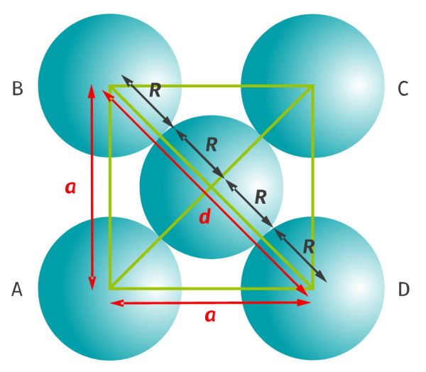 La diagonale d’une face $*d*$ vaut 4 fois le rayon $*r*$. D’autre part, la diagonale d’un carré de côté $*a*$ vaut $*a\sqrt{2}*$. Donc on a : $*a\sqrt{2}=4r*$.
