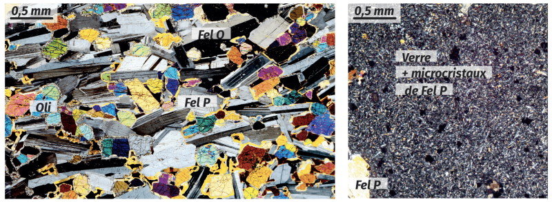 Dans le gabbro, les cristaux de minéraux sont beaucoup plus gros que dans le basalte. Donc ils ont refroidi plus lentement que ces derniers.