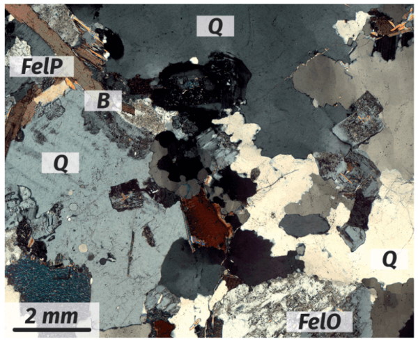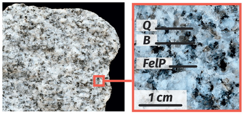 Le granite, par exemple, est une roche très courante composée de plusieurs types de minéraux : du quartz (Q) de formule $*\ce{SiO2}*$, du feldspath orthose (FelO) $*\ce{KAlSi3O8}*$, du feldspath plagioclase (FelP) $*\ce{NaAlSi3O8}*$ ou $*\ce{CaAl2Si2O8}*$ et de la biotite (B) $*\ce{K(Fe,Mg)3[Si3AlO10 (OH,F)2]}*$.