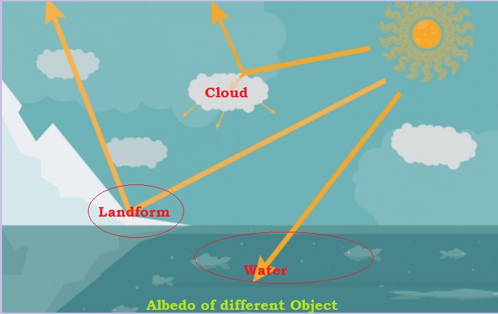L’albédo moyen de la Terre vaut environ 0,30, c’est-à-dire qu’elle réfléchit environ 30 % de l’énergie radiative qu’elle reçoit. Bien sûr, il s’agit d’un albédo « moyen ». Les nuages, la neige et les glaciers ont un albédo élevé (proche de 1) tandis que l’eau et les roches ont un albédo relativement faible.