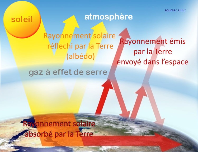 Donc plus il y a de $*\ce{CO2}*$ dans l’atmosphère, plus le rayonnement émis par la Terre est absorbé par l’atmosphère (et donc n’est pas envoyé dans l’espace). Ce énergie qui est retenue par la Terre entraîne un réchauffement.
