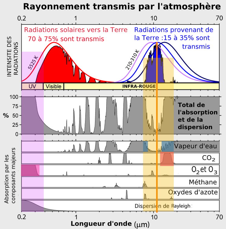 L’atmosphère absorbe une partie du rayonnement solaire reçu par la Terre, mais surtout, elle absorbe une grande partie du rayonnement émis par le sol. Grâce à ce phénomène, la température moyenne de la Terre est de 15 °C. Sans lui, cette température serait de -18 °C. 🥶
