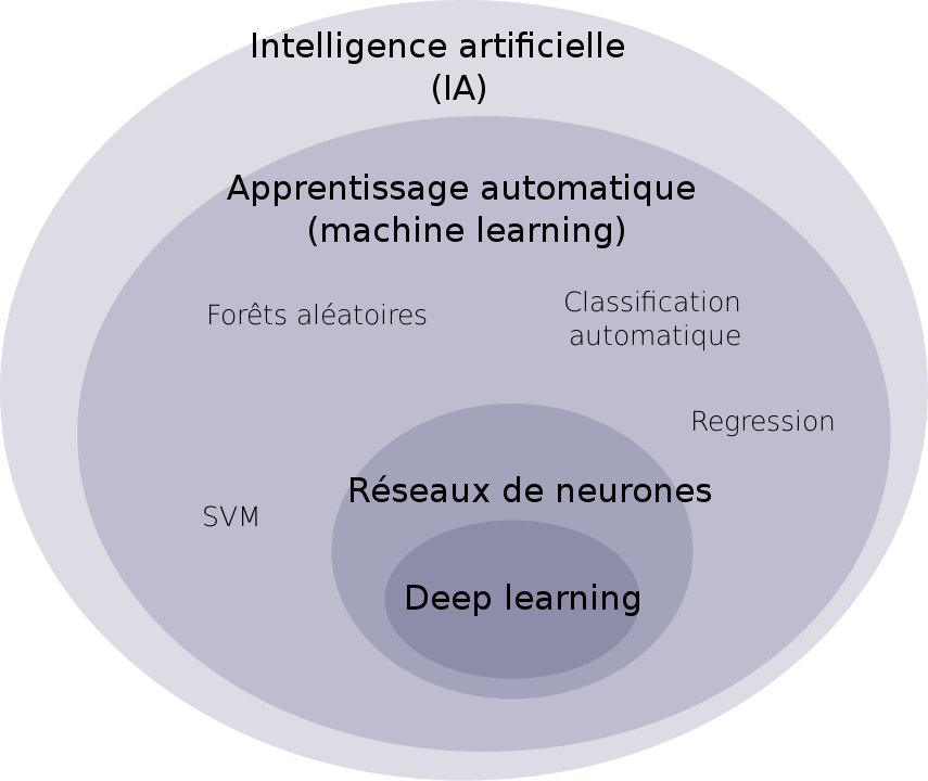 - L'apprentissage profond (deep learning) est un ensemble de méthodes d'apprentissage automatique tentant de modéliser avec un haut niveau d’abstraction des données. La machine détermine elle-même quelles sont les critères de modélisation.