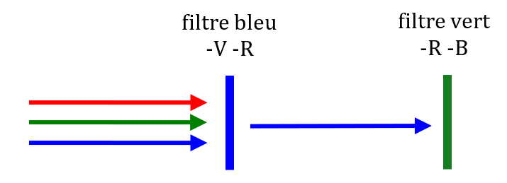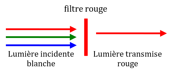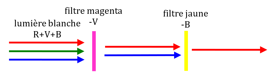 1. Pour obtenir de la lumière rouge, il faut absorber le bleu (grâce au filtre jaune) et le vert (grâce au filtre magenta).