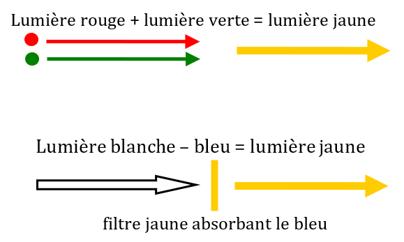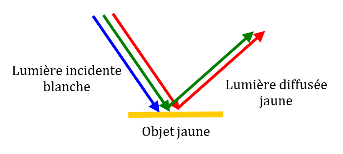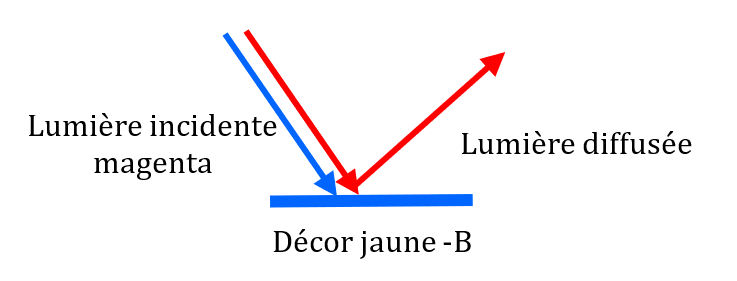 Un objet jaune (donc qui absorbe le bleu) éclairé en lumière magenta (composée de bleu et de rouge) sera rouge.