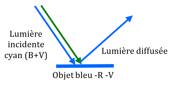 Un objet vert est capable de diffuser/transmettre le vert. Il absorbe donc le rouge et le bleu.