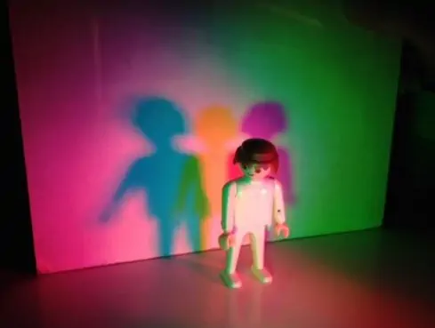 3. Pourquoi le playmobil est-il blanc alors qu’il est éclairé par des lumière colorée ?