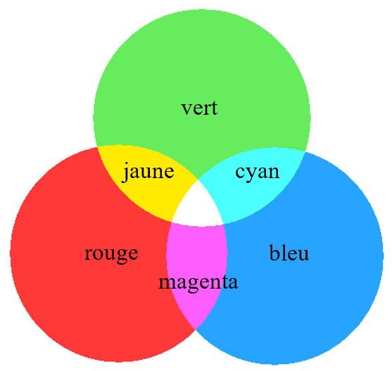La couleur d’une lumière est le résultat de la synthèse additive des couleurs qui la compose. Pour simplifier, on considèrera que la lumière blanche est composée de rouge, de vert et de bleu.