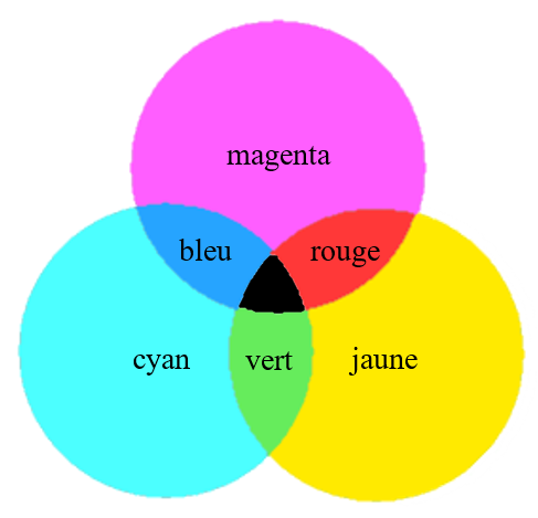 2. Les filtres cyan, magenta et jaune n’absorbent qu’une seule couleur, alors que les filtres bleu, vert et rouge en absorbent deux. On peut donc obtenir plus de couleurs différentes en utilisant les filtres cyan, magenta et jaune qu’en utilisant les filtre bleu, rouge et vert.