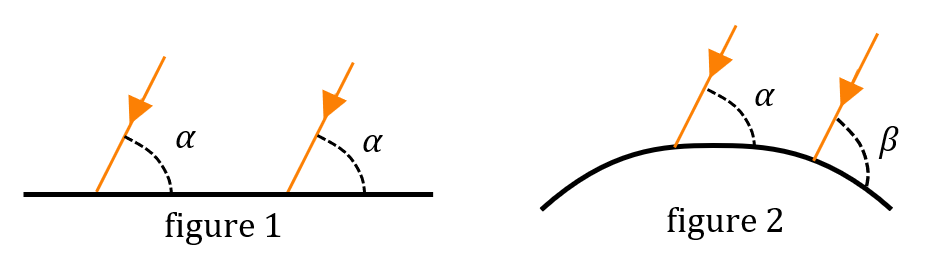 Figure 1 : hypothèse de la Terre plate. Les rayons forment tous un même angle $*\alpha*$ avec le sol.