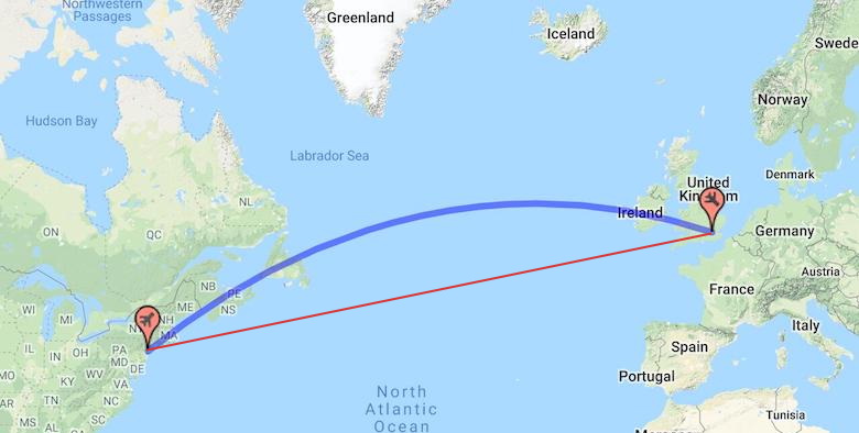 Expliquer pourquoi, lors d’un vol Londres – New York, l’avion suit la trajectoire en bleue et non la trajectoire en rouge sur l’image ci-dessous.