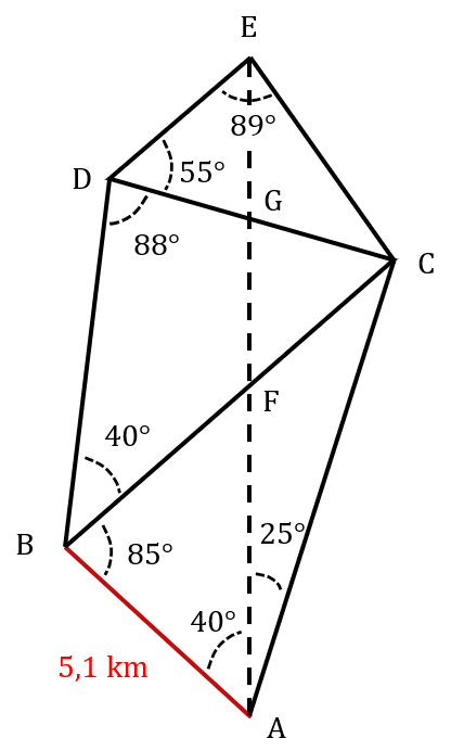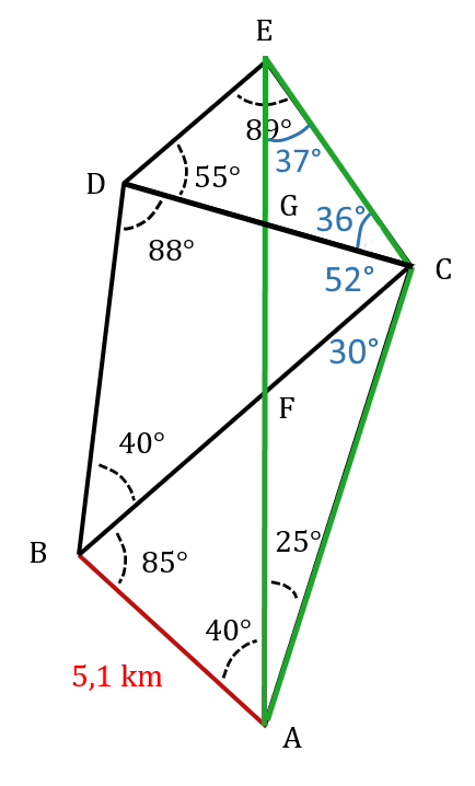 Ensuite, on se place dans le triangle ACE : $µ \begin{aligned} \frac {\mathrm{AE}}{\sin 118°} &= \frac {\mathrm{AC}}{\sin 37°} \\ \mathrm{AE} &= \frac {\mathrm{AC}}{\sin 37°}×\sin 118° \end{aligned} µ$ On trouve AE = 14,9 km.