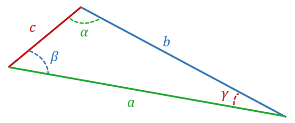 Cette relation est valable pour tous les triangles. Ainsi, si on connaît la longueur d’un côté ainsi que la valeur des deux angles qui lui sont associés (par exemple, $*c*$, $*\alpha*$ et $*\beta*$), on peut en déduire les deux autres longueurs du triangle.