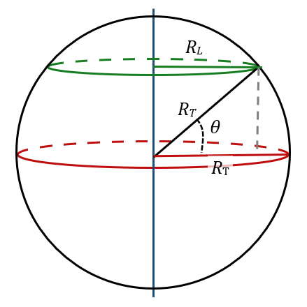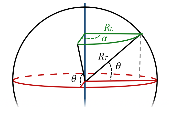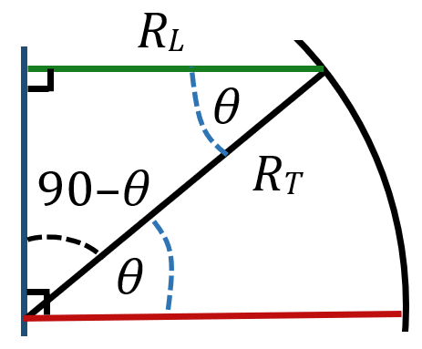 Un petit peu de géométrie de niveau collège permet de montrer que $*R_L = R_T·\cos \theta*$ ou encore $*R_L = R_T·\sin (90 - \theta)*$