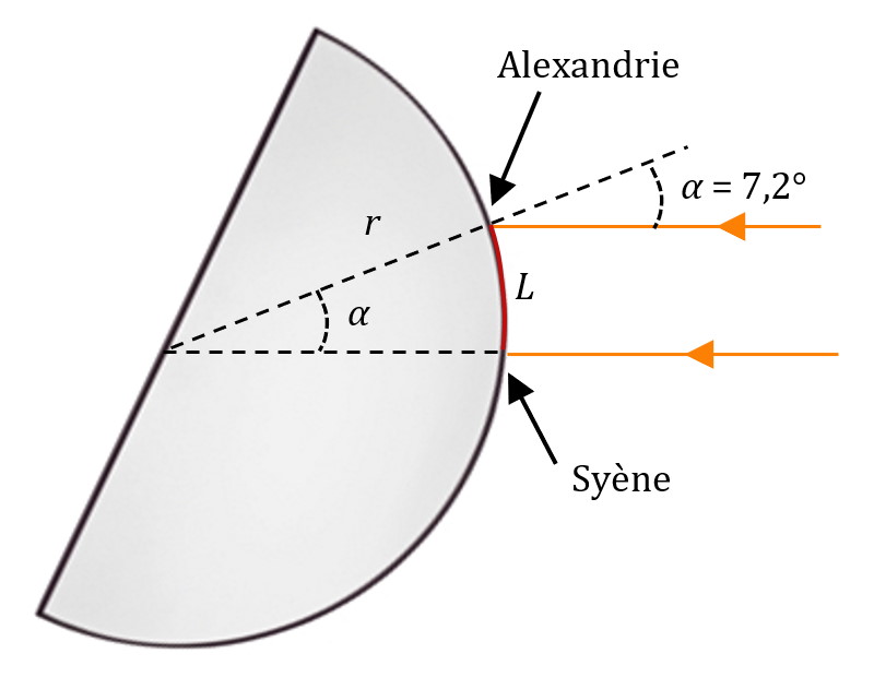 Il a donc pu déterminer le rayon de la Terre avec une bonne précision, en utilisant la formule $*L = \alpha ·r*$ :