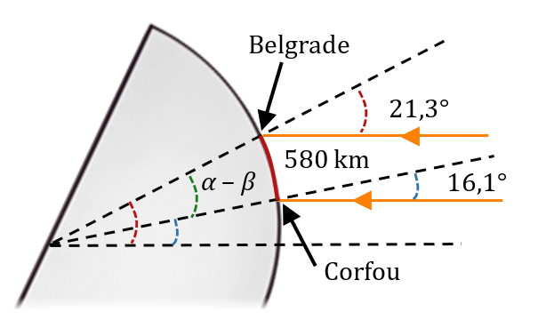 3. $* L = r·(\alpha \; – \beta)*$, avec $*r*$ le rayon de la Terre et $*L*$ la distance Belgrade - Corfou.