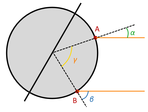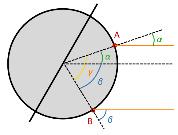 4. On considère maintenant deux points A et B situés sur le même méridien B étant au sud de A. A et B sont situés de part est d’autre du tropique nord. Au midi solaire, le 21 juin, les rayons du soleil arrivent en A inclinés avec un angle $*\alpha*$ par rapport à la verticale, et en B avec un angle $*\beta*$ par rapport à la verticale. Que vaut l’angle $*\gamma*$ formé par les rayons de la Terre passant par A et B ?
