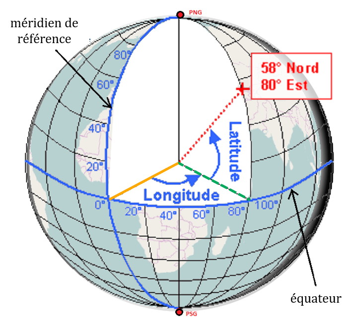 On repère un point à la surface de la Terre par deux coordonnées angulaires (c’est-à-dire que ces coordonnées sont des angles), sa latitude et sa longitude. Ces deux coordonnées sont définies à partir de deux références : l’équateur pour la latitude et le méridien de Greenwich pour la longitude.