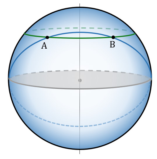 Le plus court chemin entre deux points A et B à la surface de la Terre est l’arc du grand cercle qui les relie. Autrement dit, l’arc du cercle ayant pour centre le centre de la Terre et sur lequel se trouvent les deux points (en bleu).