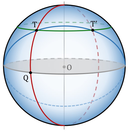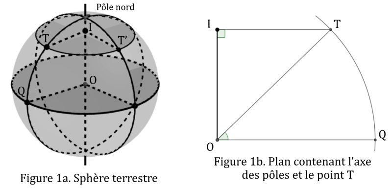 On note O le centre de la Terre et T, Q et T’ les villes Toronto, Quito et Toulouse. On note I le centre du parallèle passant par Toronto et Toulouse. Sur le schéma ci-dessous (figure 1a) représentant la sphère terrestre, on a placé les points O, I, Q, T et T’.