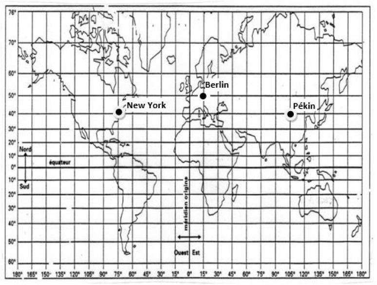 3. Pékin : 40°N – 105°E et New-York : 40°N – 75°O