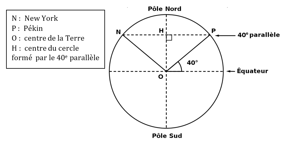 4. En utilisant les coordonnées de New York et de Pékin, montrer que chacun des arcs de parallèle reliant New-York à Pékin est un demi-cercle.