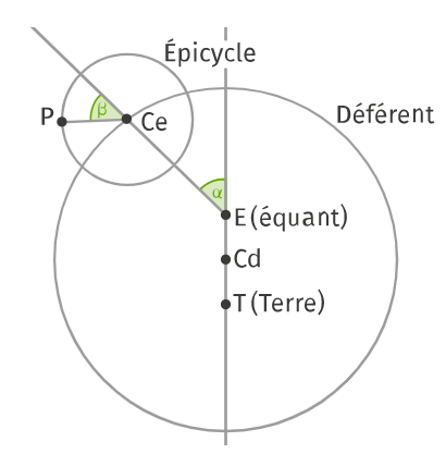 Une planète P décrit un cercle, appelé épicycle, qui lui-même décrit un cercle appelé déférent. La vitesse de rotation (vitesse angulaire) de P est constante par rapport à un point appelé équant, qui n’est pas le centre du cercle déférent.