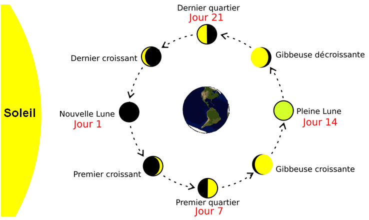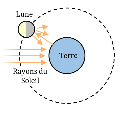Les phases de la Lune sont dues à la variation de l’angle d’éclairage de la Lune par le Soleil.