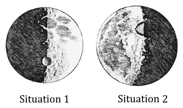 1.b. Dessiner ce que Galilée aurait observé dans les deux situations de la figure 1 si la surface de la Lune était parfaitement lisse.