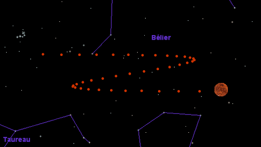 - Mouvement rétrograde de Mars : Mars semble parfois reculer quelques jours, par rapport aux astres fixes, avant de reprendre sa trajectoire circulaire. La dernière fois que c’est arrivé, c’était du 9 septembre au 15 novembre 2020. La périodicité de ce phénomène est d’environ 780 jours.