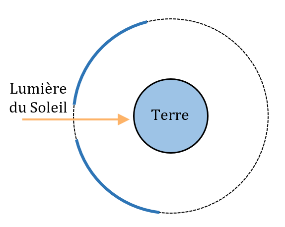 3.b. La lumière cendrée s’observe lorsque la Lune est « en croissant », c’est-à-dire lorsque la Lune est dans les parties bleues ci-dessous de son orbite.
