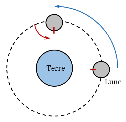 Pendant que la Lune parcourt un quart de son orbite (flèche bleue), elle tourne d’un quart de tour sur elle-même (flèche rouge). De cette manière, un point particulier de la surface de la Lune faisant face à la Terre (un cratère par exemple, matérialisé par un trait rouge) continue à faire face à la Terre pendant le mouvement de la Lune sur son orbite.