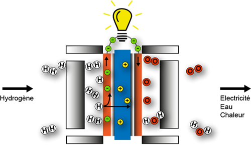 Dans une pile à combustible fonctionnant à l’hydrogène (souvent appelée « pile à hydrogène »), un réservoir de dihydrogène H2 alimente la pile. Il s’agit d’un des deux réactifs nécessaires, l’autre étant le dioxygène O2 directement pris dans l’air.