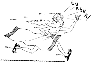 Selon Vitruve, le mot Eurêka (signifiant « J’ai trouvé ! ») a été prononcé par Archimède en courant nu à travers les rues de Syracuse car il venait de trouver la solution à un problème posé par Hiéron II, tyran de cette ville.