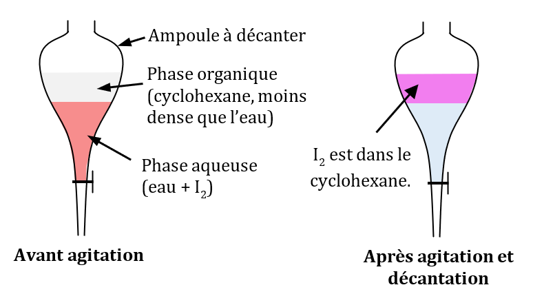 2. Dessiner l’ampoule à décanter avant puis après agitation, en indiquant la composition des phases.