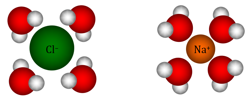 Un anion solvaté est entouré de molécules d’eau présentant leurs atomes d’hydrogène chargés δ+, tandis qu’un cation solvaté est entouré de molécules d’eau présentant leurs atomes d’oxygène chargé δ–