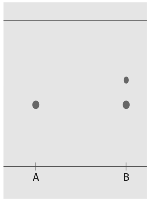 Après une synthèse, on réalise une CCM et on obtient le chromatogramme ci-dessus. Le dépôt A correspond à l’eugénol commercial pur et le dépôt B au produit obtenu.