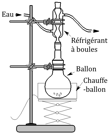 Il faut souvent (mais pas toujours !) chauffer les réactifs pour que la réaction se fasse. Pour cela, on a recours à la technique du chauffage à reflux (montage ci-dessous) qui permet d’éviter le problème de la surpression et la diffusion de vapeur dans le laboratoire.